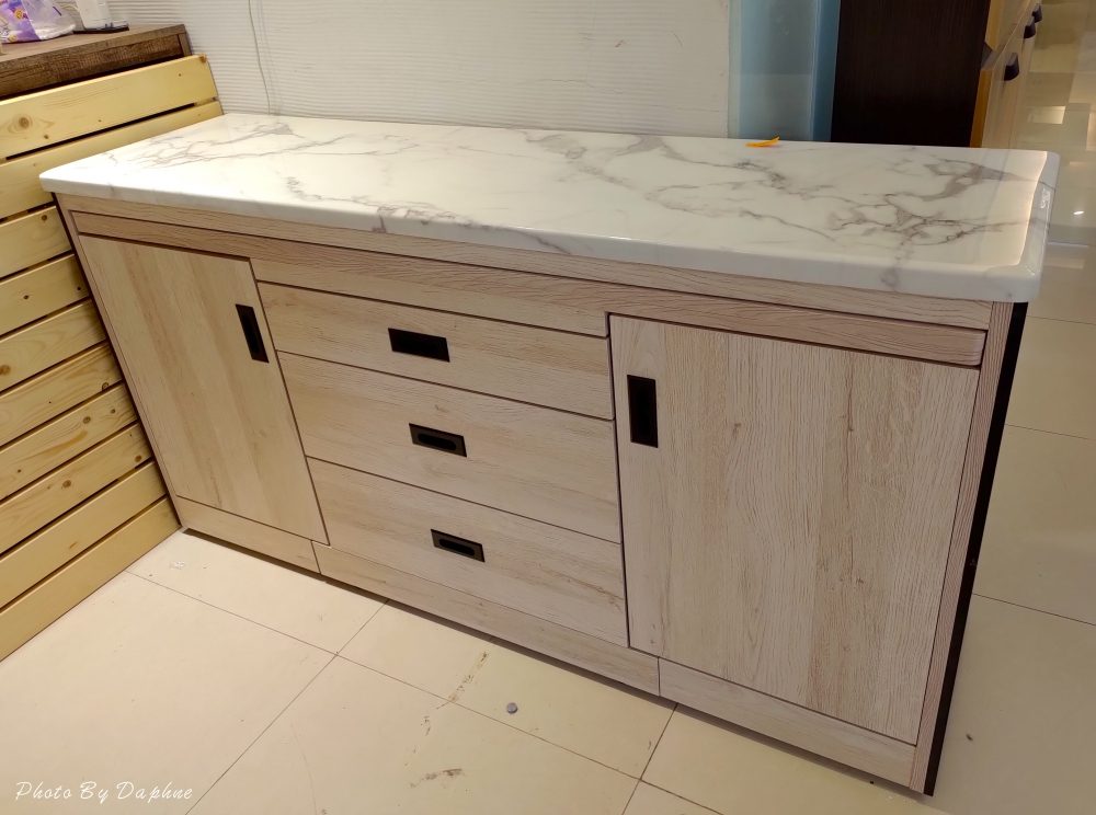 ▼小法式4尺餐櫃有抽屜、拉門,封閉與開放式收納法兼具,收納起來很輕鬆,作為零食儲藏櫃好用,中間隔板可用來放馬克杯。