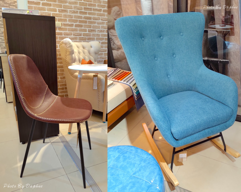 ▼迪倫鐵衣紅酒皮餐椅車縫工藝細緻, 寬大舒適椅背,久坐也不累。維多莉亞單人搖椅表面是棉麻布料, 觸感細緻,是透氣材質。