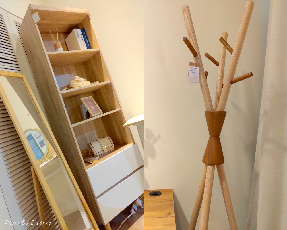 ▼實木穿衣立鏡、瑪莉歐原切白二尺書櫃都是在窄小空間能搭出品味的商品,右邊原木色的巴蕾衣架更具特色,美觀又省空間。