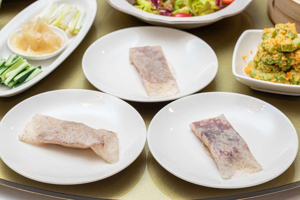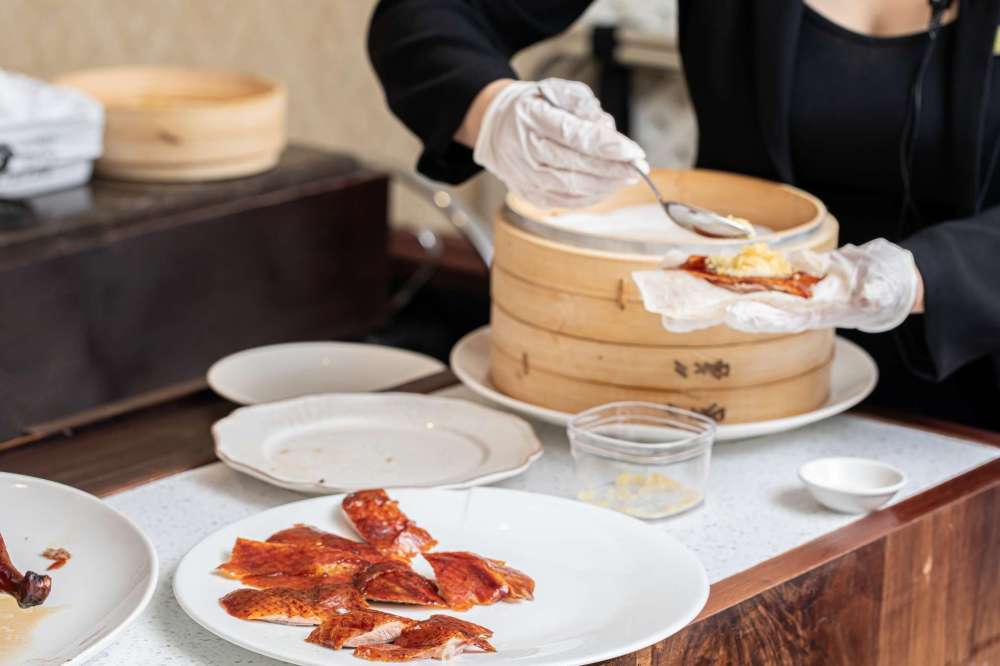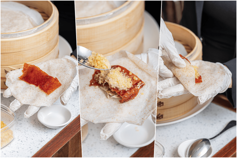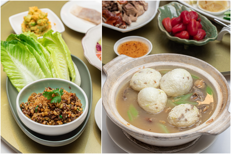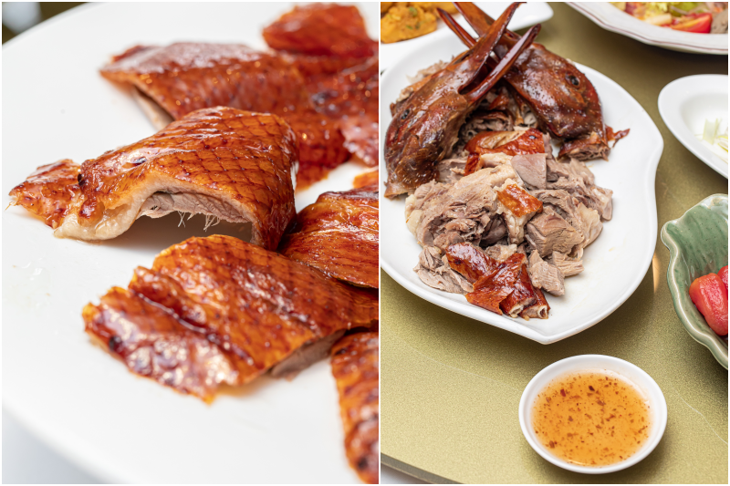 以烤鴨菜色來說,依舊是壯碩飽滿的當場片皮切肉,一共打造出包括麥餅跳舞片皮鴨跟荸薺鴨鬆蘿蔓葉,再加上棉花鴨骨湯泡飯等多道菜色
