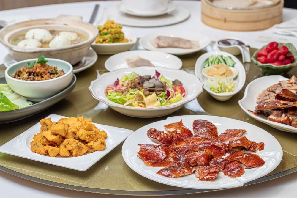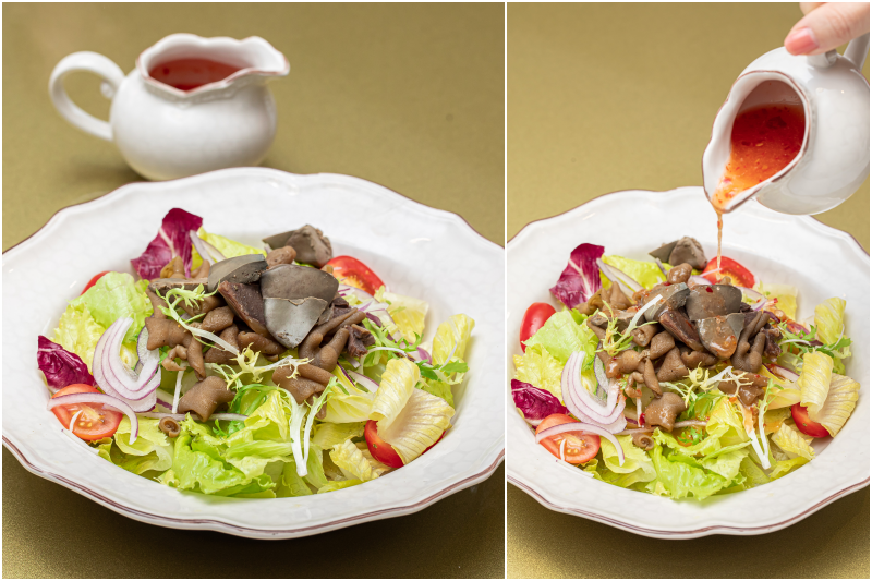 其中的菜色包括泰式涼拌沙拉集與金沙爽脆杏鮑菇,加上最重要的烤鴨菜色,一共有麥餅跳舞片皮鴨跟荸薺鴨鬆蘿蔓葉,再加上棉花鴨骨湯泡飯
