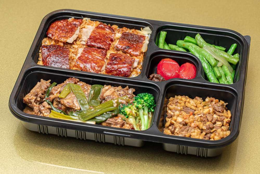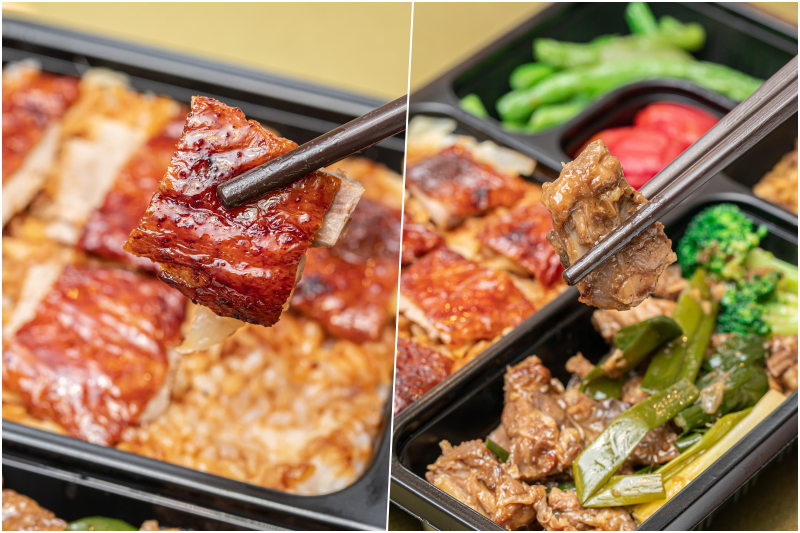 一個便當裡面有片鴨壽司飯、醬炒鴨鬆丁、薑蔥炒鴨骨三種經典菜色,然後加上梅漬番茄跟季節時蔬等,是不是超級划算呢,即日起到八月底都有喔(可以來電九華樓訂購)