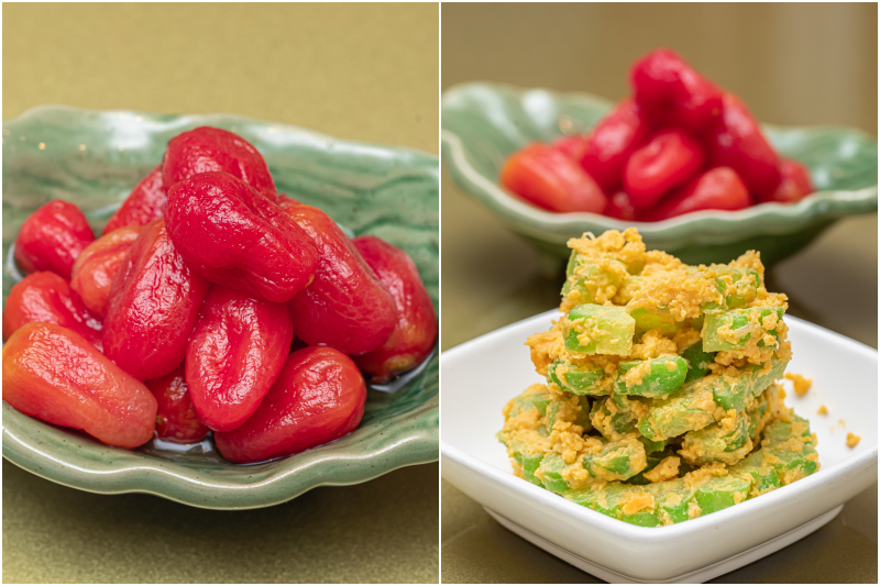 首先,就是兩道非常生津的小菜,左邊的是梅汁小番茄,右邊的是鹹蛋黃苦瓜。說真的,百分百不同的味道,卻有相同的開胃生津感