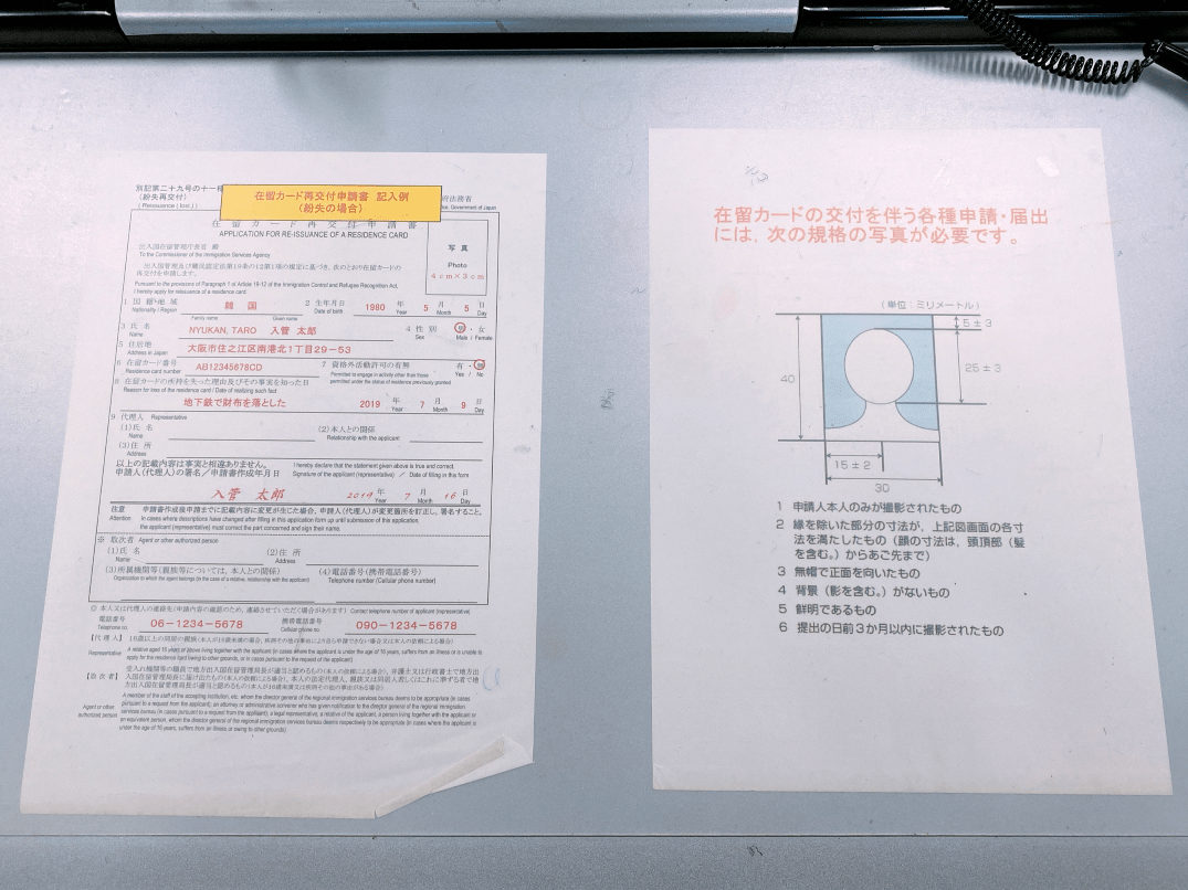 申請櫃檯在二樓,上樓後先到旁邊服務處說要拿在留期限延長的申請書(因為日文苦手,小莓直接把理由書秀給人員看XD),寫字桌上有證件照的規定說明。(左邊那張是丟失在留卡時的申請書,無關XD)