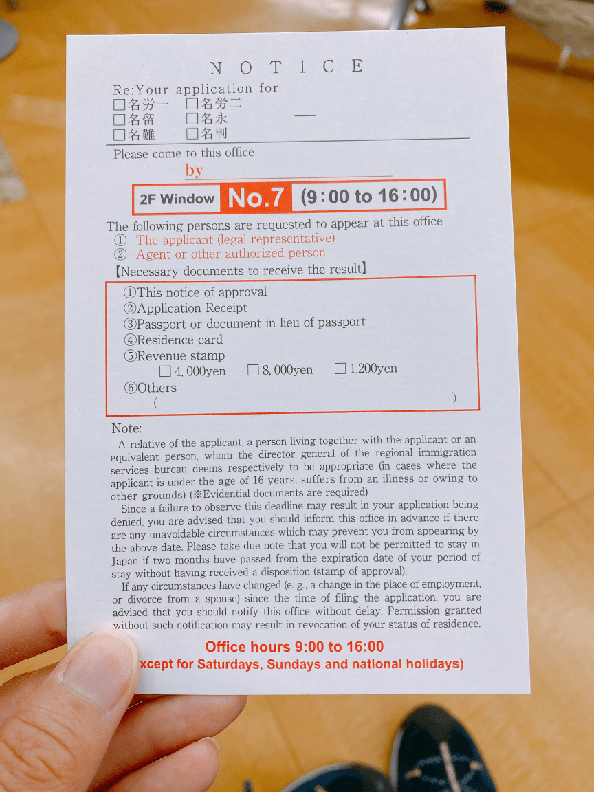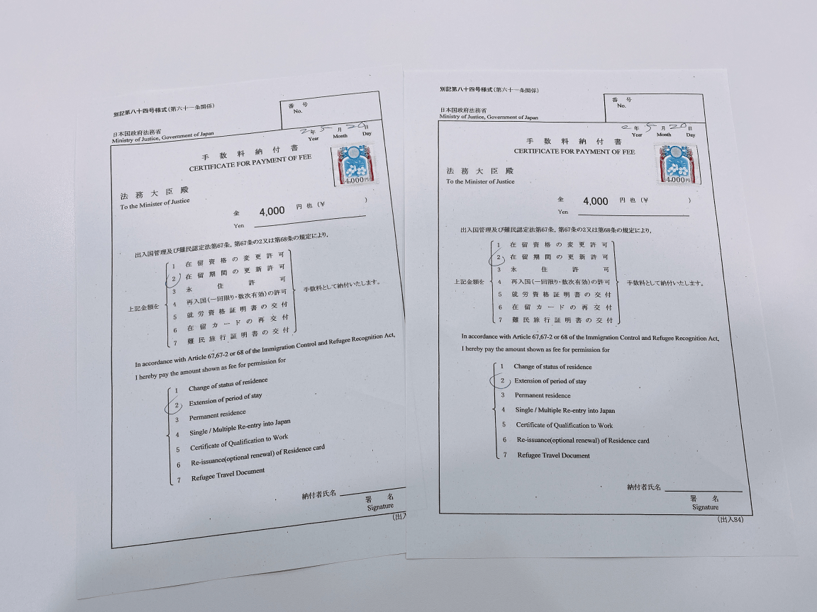 為什麼要花4000日圓?所以有申請成功嗎?沒申請過的話4000日圓會退還嗎?雖然滿頭問號,但語言不夠通又身心俱疲的我們還是照買了,買完回到櫃檯遞交後,突然⋯⋯我們就拿到了延長六個月新的在留卡了!!!