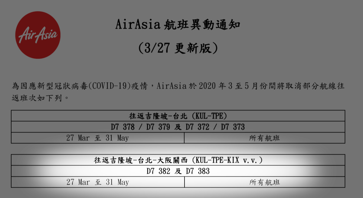 這次延長的經驗也有一點很不可思議,就是AirAsia這家航空公司的公告⋯⋯我們原本預計要搭回台灣的飛機是AirAsia的D7 383這班飛機,官網說要2天前才會知道飛機會不會停飛,所以我們一直在注意航班狀態,後來小莓發現他們的Facebook在3/27就已經發表停飛資訊?為什麼官網找不到這份PDF,反而是公佈在Facebook啊?!