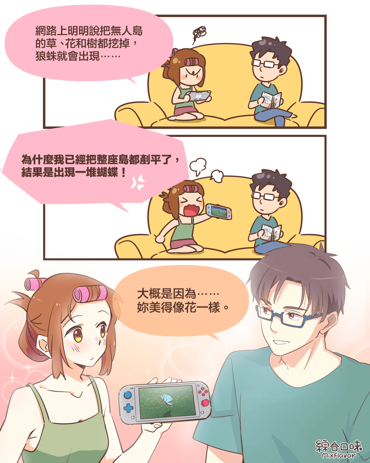 綜合口味 2020/06/11瀏覽: views 後來詳細調查才知道原因:昆蟲出現的種類,是依玩家「出島的時間」為準。狼蛛出沒的時間是晚上七點,就算玩家出發的時間是六點五十九分,那不管待多晚,狼蛛都不會出現⋯⋯白話一點就是小莓太早去,所以只會有白天的昆蟲⋯⋯ 附上滿滿蝴蝶的無人島。 另外,好多朋友自從開始玩動物之森都瘦了(還是說虛脫?),因為大家都廢寢忘食的在佈置島嶼和抓狼蛛賺錢,小莓本來玩這款遊戲之前也很期待自己變瘦的那一天,殊不知⋯⋯ 玩遊戲時在旁邊準備零食彈藥不是常識嗎?! 原文出處:綜合口味 Related Items好有趣家庭生活 圖文觀點 2020/06/11瀏覽: views 綜合口味 喜歡以輕鬆治癒的畫風,將日常中的酸甜苦辣化為可愛有趣的故事!秉持著「世間沒有萌不起來的東西」信念,持續創作中! Related Items好有趣家庭生活 next page