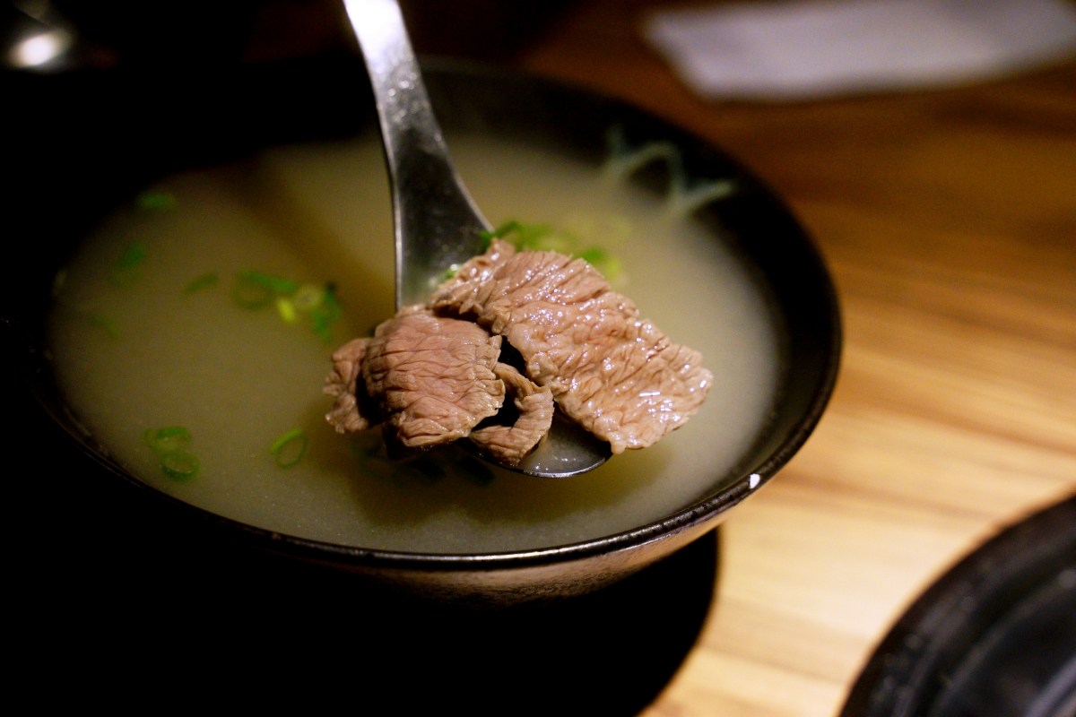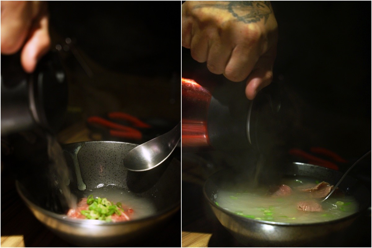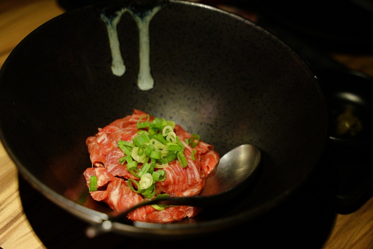 服務人員會帶著生牛肉與一壺熱湯在桌邊現沖,看著熱騰騰的熱湯將生牛肉漸漸燙熟的過程很是療癒,味增湯頭剛剛好,不會太濃,我很喜歡的一碗接一碗,牛肉要趕快吃掉不然會太老,所以燙完拍完照就趕快撈一撈和朋友分著吃光光,爽!