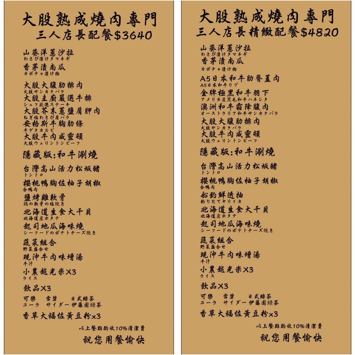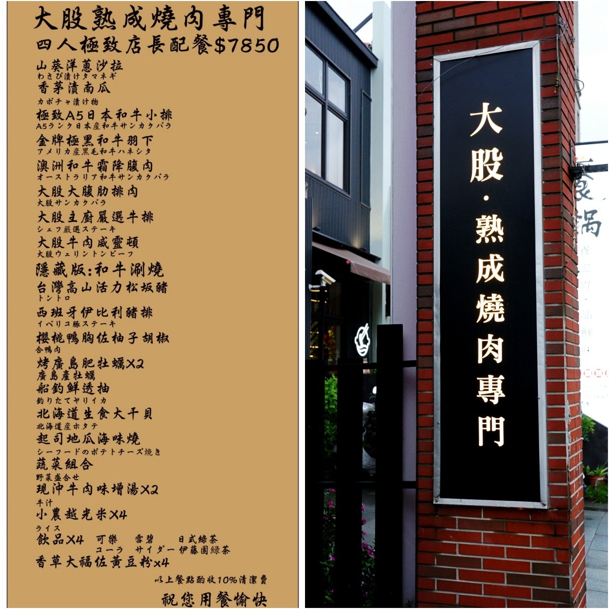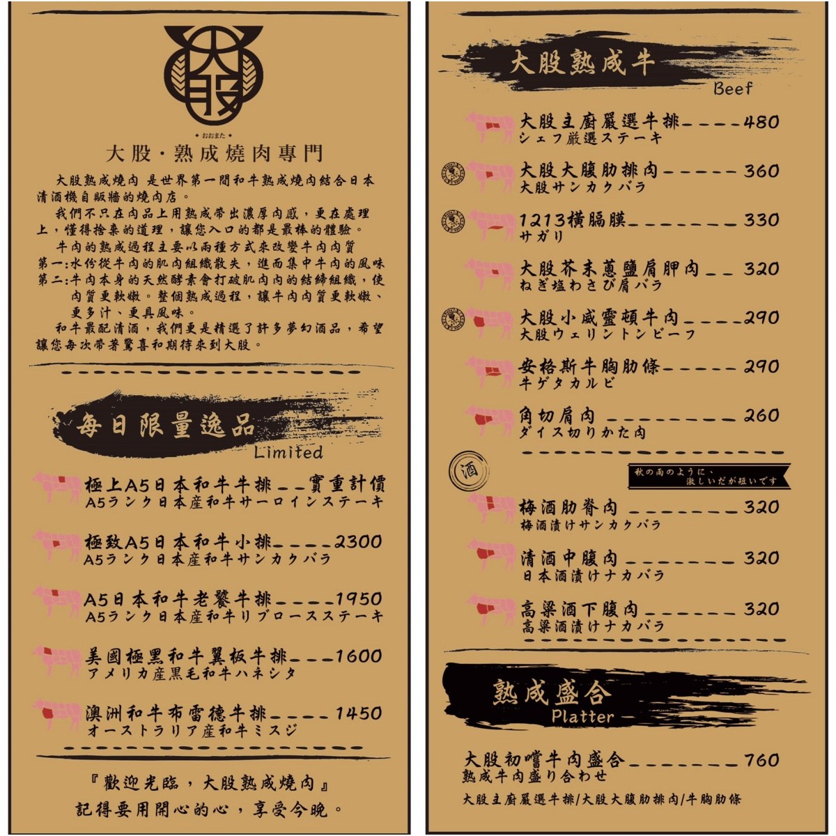 大股熟成燒肉專門就是以提供熟成牛肉為主的燒肉店,這句話好像廢話,但我要說的是除了牛肉還有豬肉、鴨肉、雞肉和海鮮,所以不吃牛肉一樣可以來享用美味的燒肉,由於是專人燒烤,每樣肉品都能在專業的服務人員手下發揮最厲害的口感與風味。