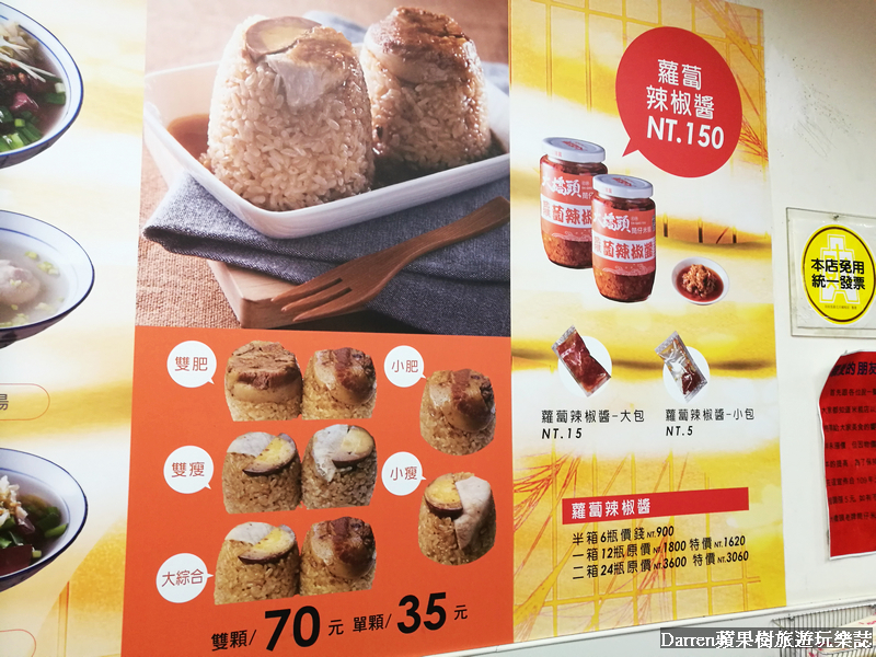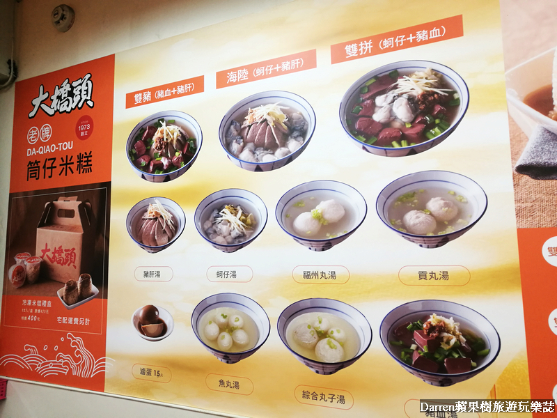 大橋頭米糕菜單MENU,以米糕為主可以選擇瘦肉或肥肉,也能選擇綜合,再來就是各種湯品,有綜合丸子湯、豬血湯、蚵仔湯、豬肝湯、海陸湯、雙拼湯等