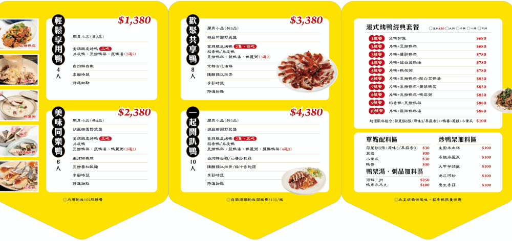 再來,一共有十種不同套餐,以及四到十人的不同桌菜料理,熊這次跟幾位格友就是品嚐一起開趴鴨十人桌菜(4380元,十人份)