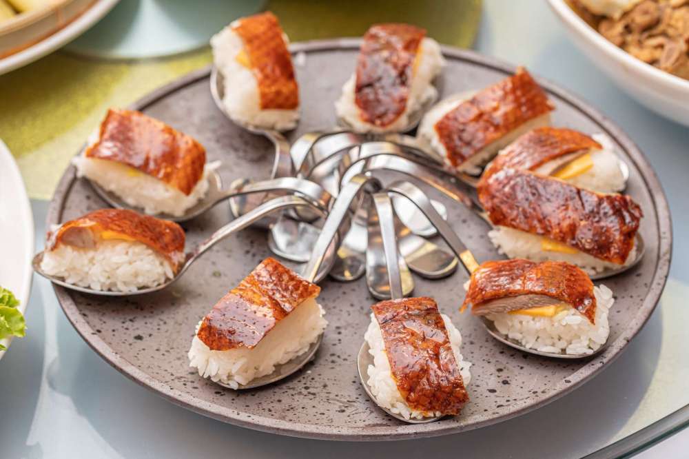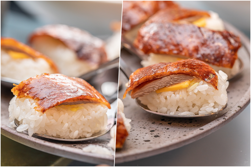 原來,所謂的稻香鴨,其實是一道顛覆傳統烤鴨多吃概念的特色菜,它的外型跟入口感受反倒比較像是日式握壽司,但除了搭配芥末之外,還有口感溫潤的法國切片起司與脆口鴨皮與多汁鴨肉
