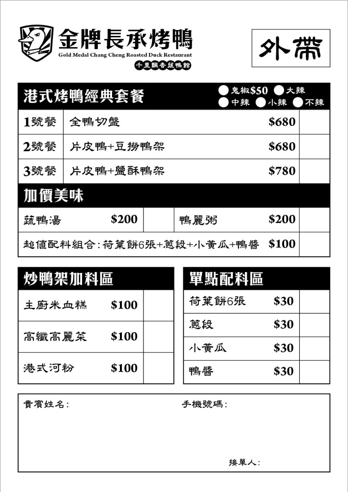 再來,就是金牌長承烤鴨的菜色部分,簡單來說,可以分成內用跟外帶,內用的部分可以單點也有搭配套餐跟多人桌菜