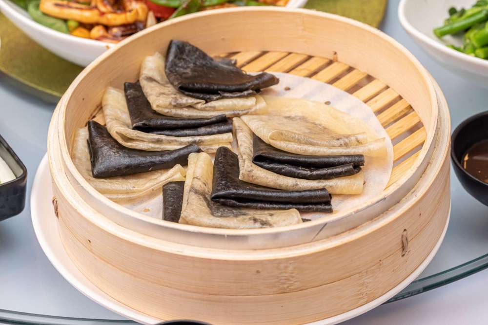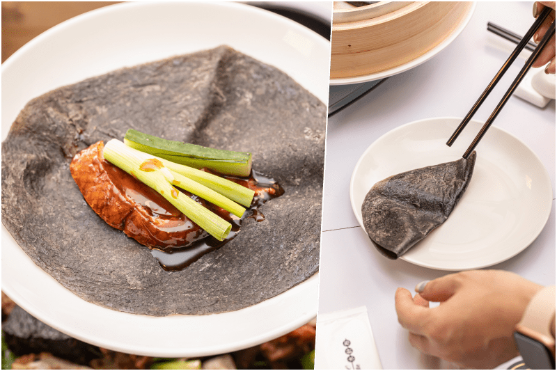 肥瘦恰到好處的烤鴨片完之後搭配宜蘭三星蔥跟黃瓜還有秘製鴨醬,然後可以搭配兩種不同口味的餅皮,無論是原味或是黑芝麻都相當適合,也跟坊間的做法有一點不同