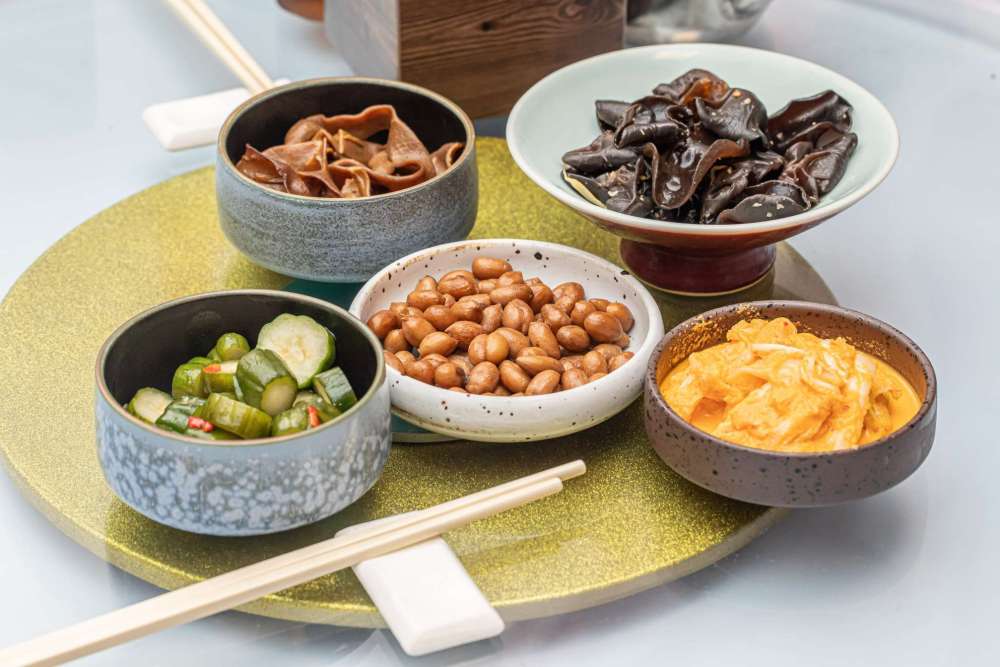 看完菜單,再來就正式進入金牌長承烤鴨的一起開趴鴨十人桌菜(4380元,十人份)時間,首先上桌的是包括木耳與黃金泡菜,還有鴨腸跟滷花生還有小黃瓜等五種開胃小品