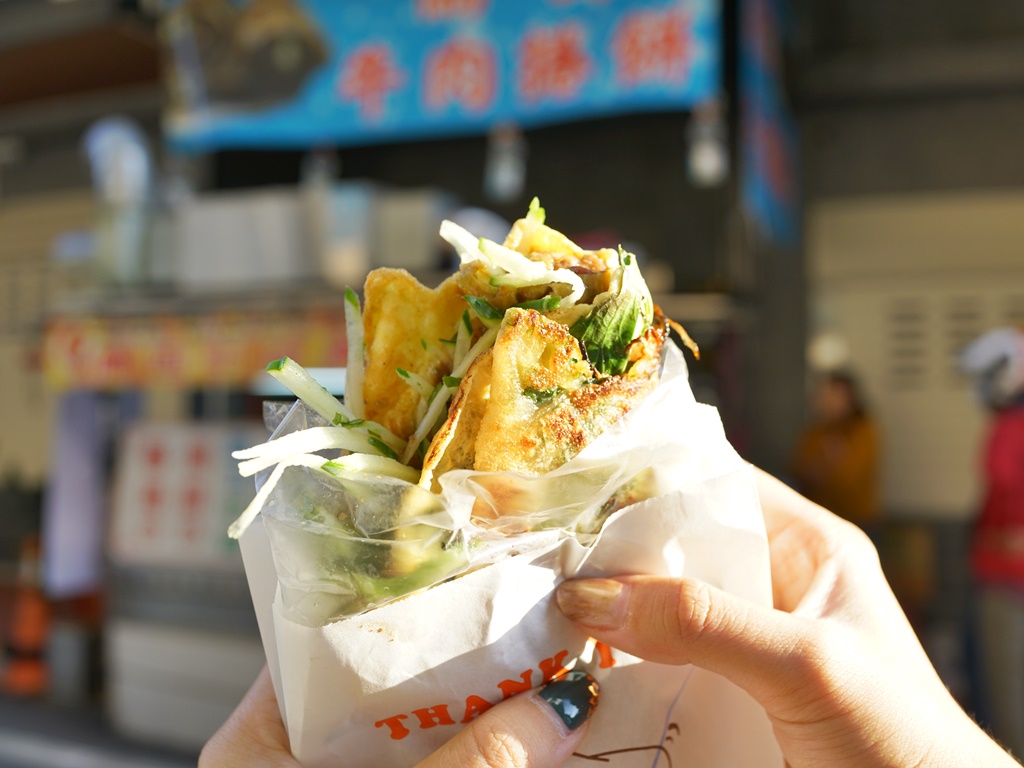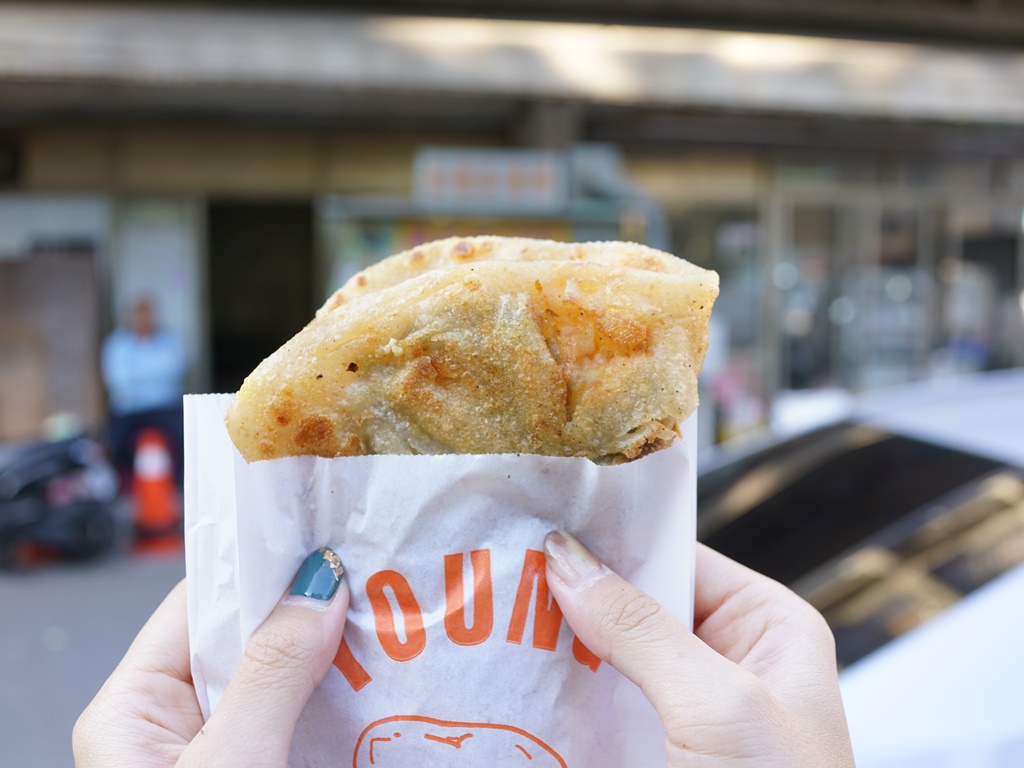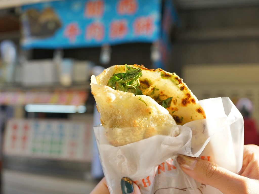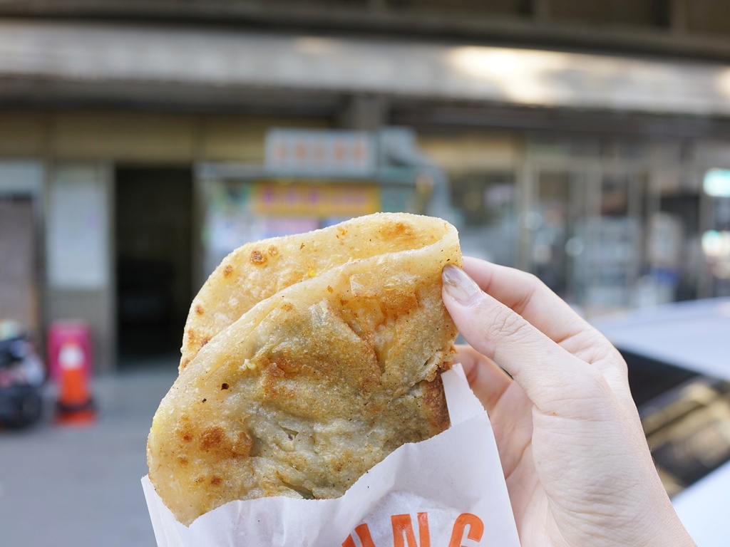 他們的蔥油餅採現點現做,點了之後老闆娘開始快速的擀平麵糰、放上煎台煎熟,動作迅速到我根本來不及拍哈哈,很快就拿到手了!蔥油餅趁熱吃口感香酥,還加了九層塔增添香氣,15元好划算!