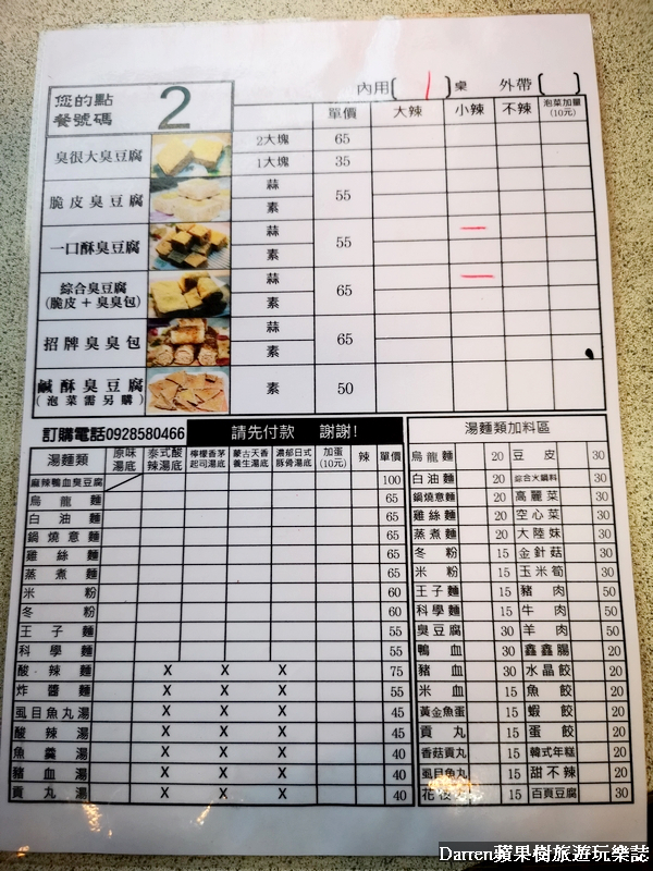 臭很大臭豆腐菜單,臭豆腐有6種品項組合可以選擇,臭豆腐現點現炸,另外還有湯麵類,很特別的是湯麵可以加料,就像火鍋一樣加料都是單點