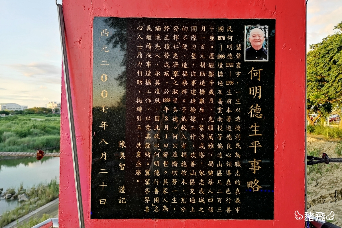 「行嘉吊橋」位在八掌溪上,結合八掌溪河堤公園,據說是嘉義最長的吊橋,也是通過嘉義市的一個吊橋,這座吊橋是當初為了確保學童上學的安全,雖然八掌溪有軍輝橋可以讓民眾通過,但橋上的來往車輛多,故建立這座行人吊橋,而且這座吊橋是由嘉義市民每年捐款慢慢累積而成的,再由何明德行善團於10個月內所建造完成的。知道了這條吊橋含義後,覺得蠻感動的,讓這座吊橋有了一個溫暖的故事。