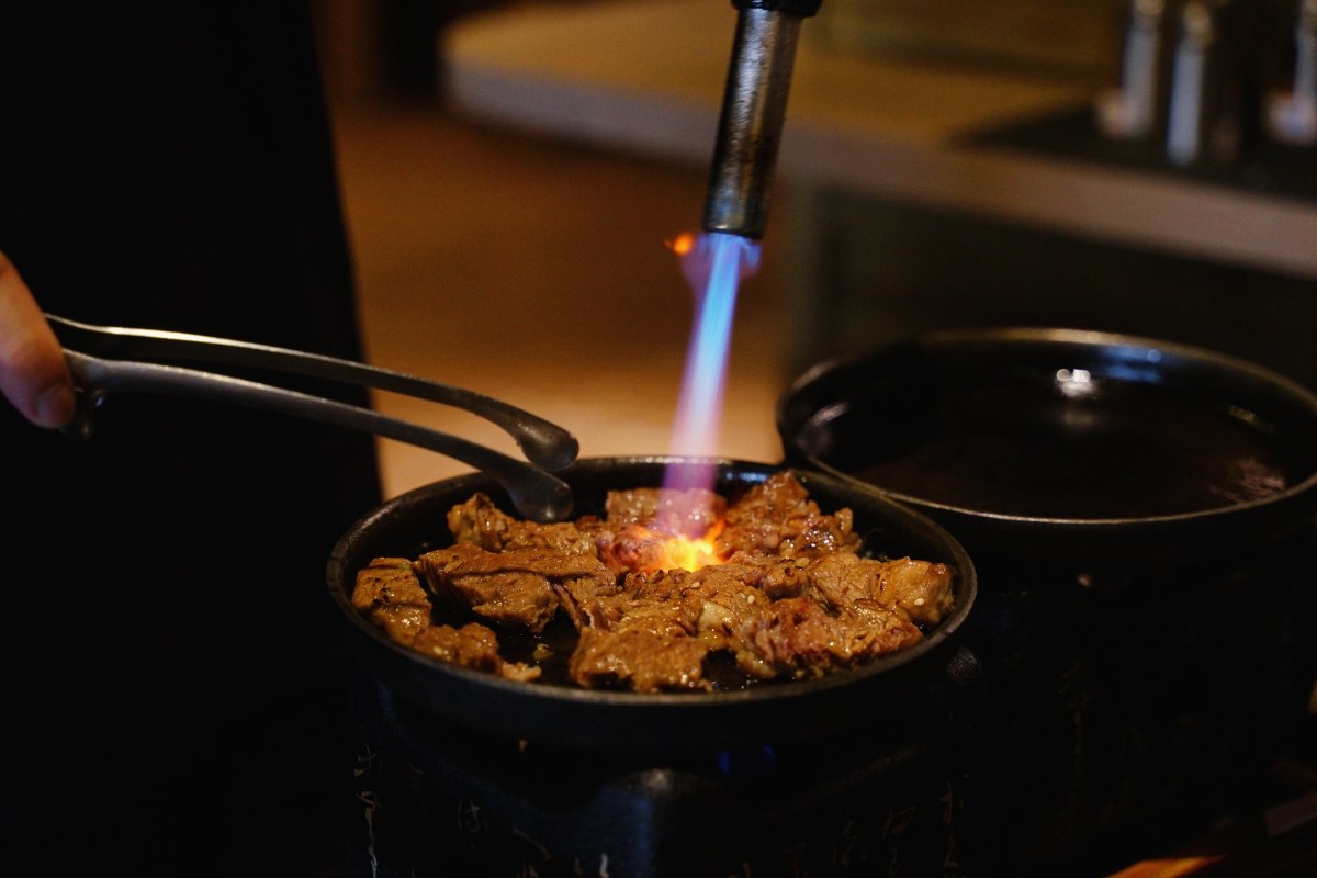 服務人員在桌邊直接火烤,中間也會使用噴槍幫助牛排均勻受熱來掌握熟度,看著服務人員專業又快速的動作,真心覺得各行各業的人都值得尊重啊!那些都是日積月累的經驗,才讓我們能夠這麼開心地吃到好吃的烤肉定食。