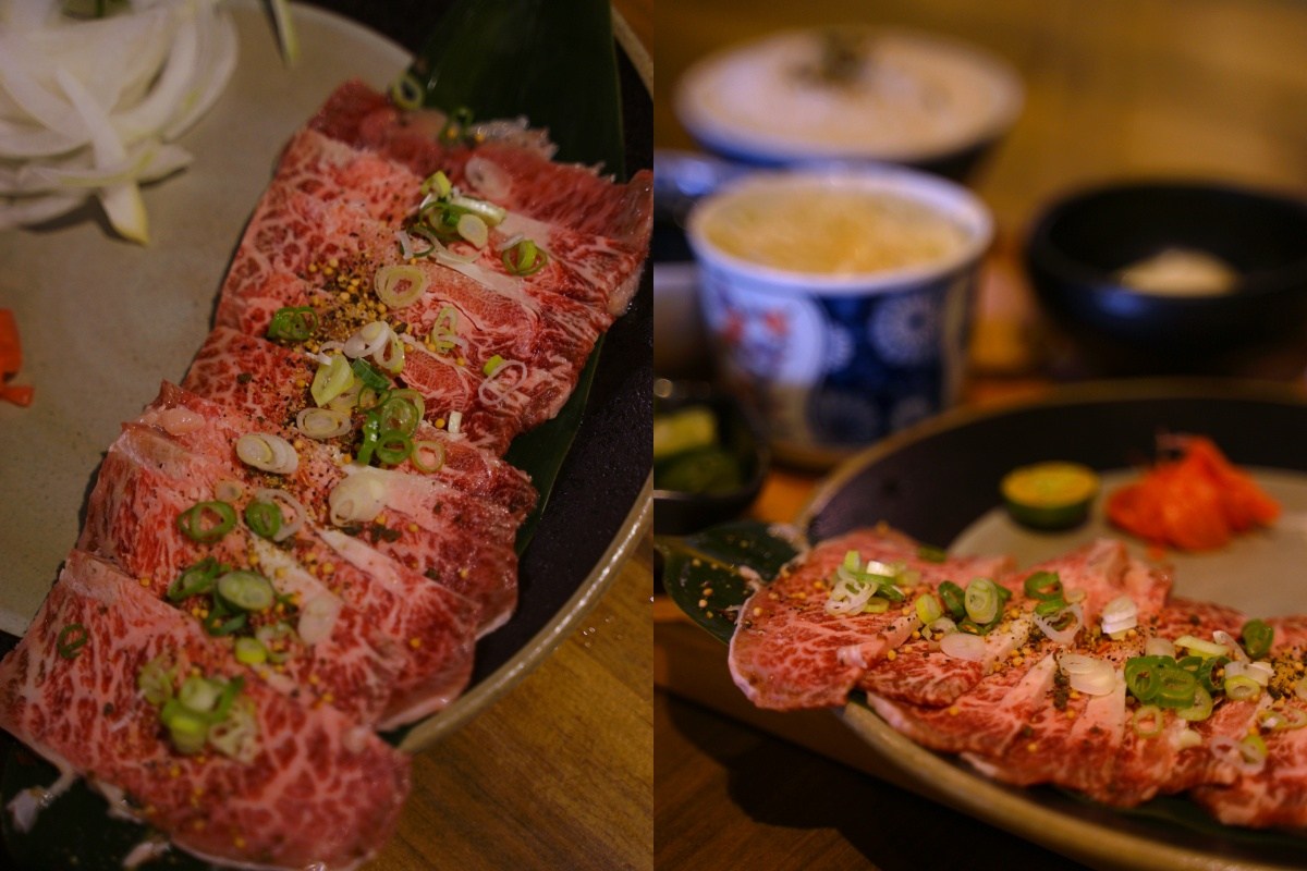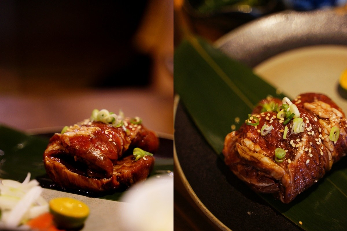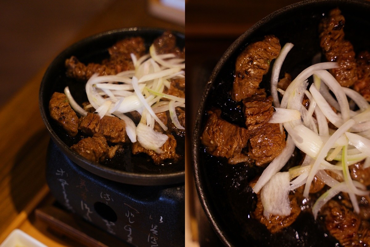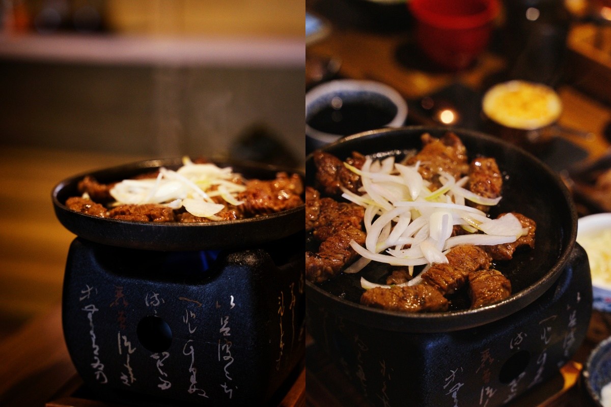 這道餐點是讓客人自己在鐵盤上燒烤,但是請放心!這個沒什麼難度,只是要小心鐵板很燙不要燙到手。我個人喜歡的熟度是兩面都烤到像右邊那樣顏色就可以夾起來入口,厚薄度剛剛好,沾燒肉醬汁或是椒鹽都很不錯,吃完一片還想再來一片的那樣好吃。