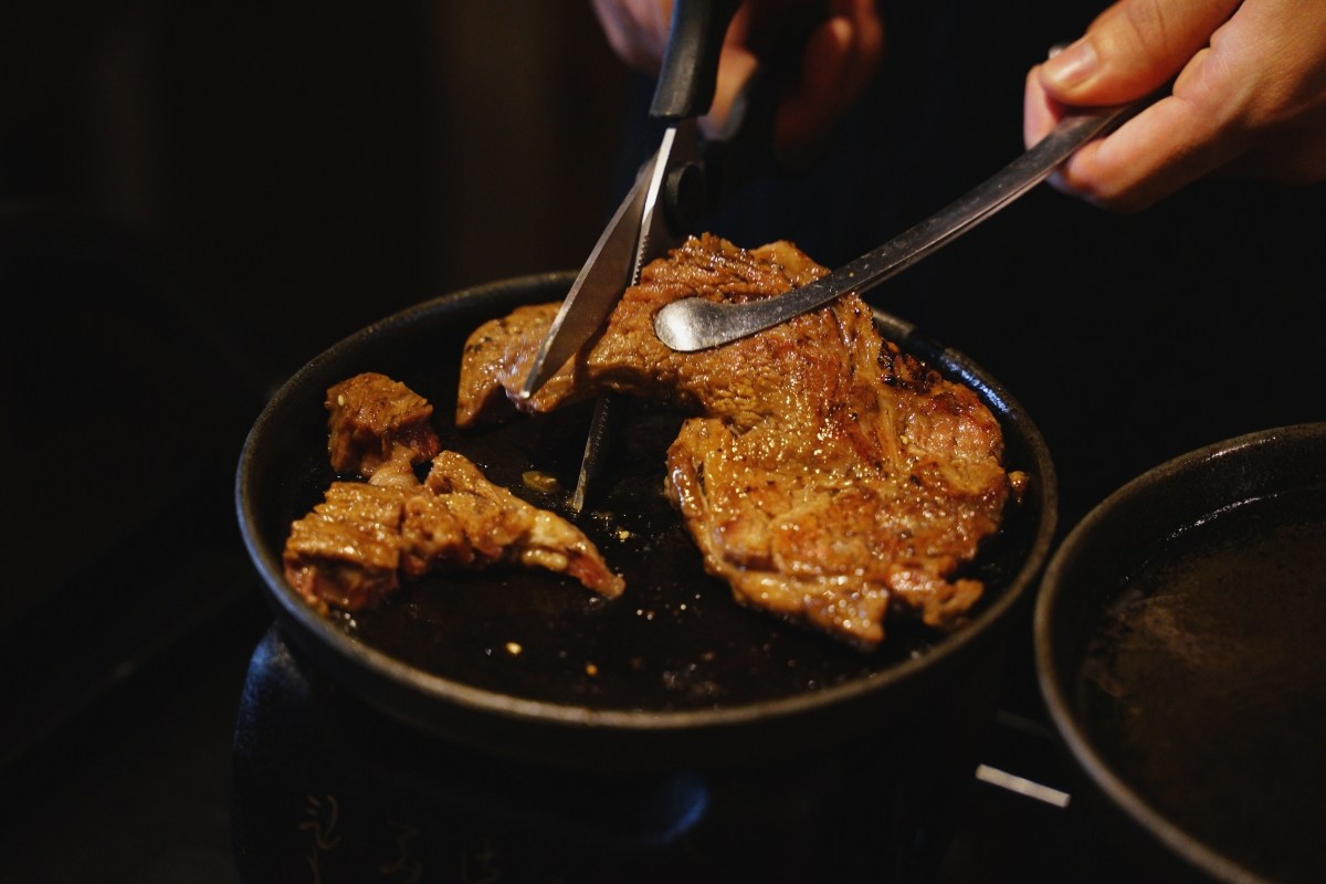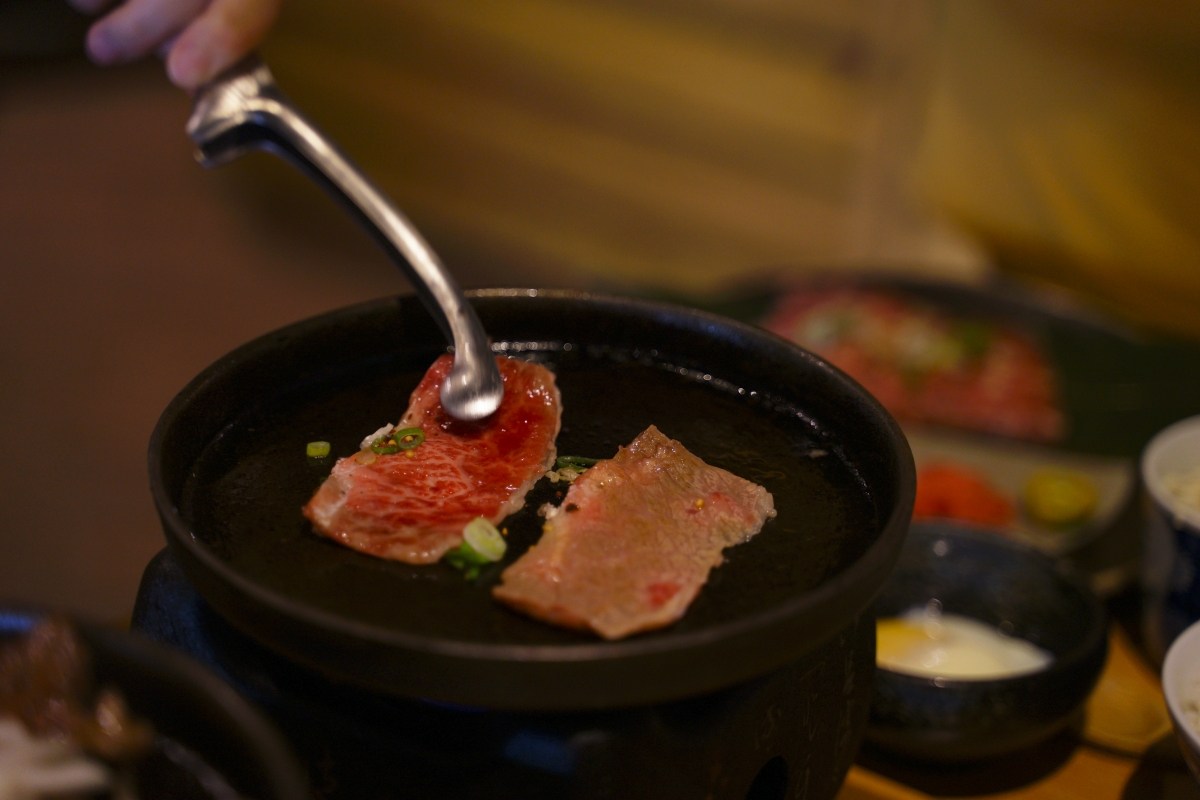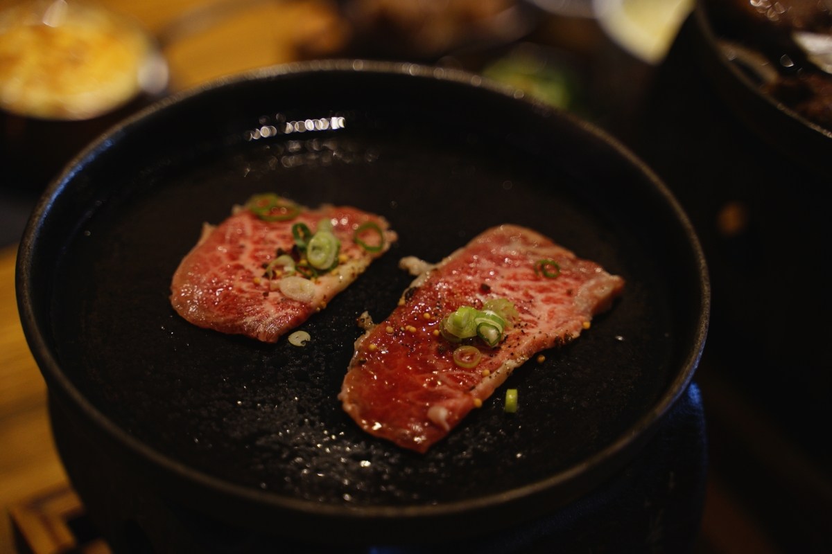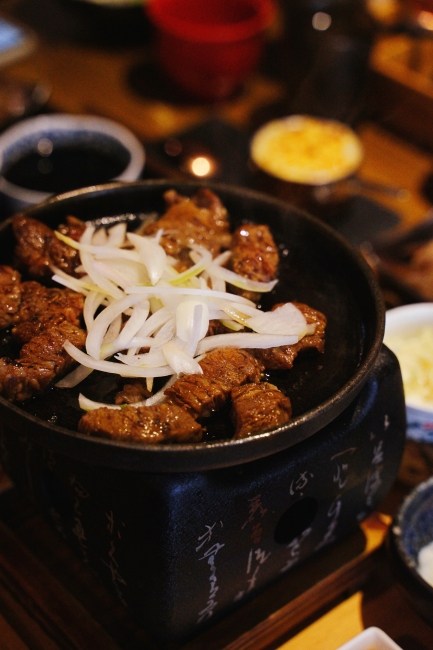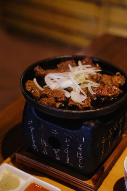 這道餐點是讓客人自己在鐵盤上燒烤,但是請放心!這個沒什麼難度,只是要小心鐵板很燙不要燙到手。我個人喜歡的熟度是兩面都烤到像右邊那樣顏色就可以夾起來入口,厚薄度剛剛好,沾燒肉醬汁或是椒鹽都很不錯,吃完一片還想再來一片的那樣好吃。