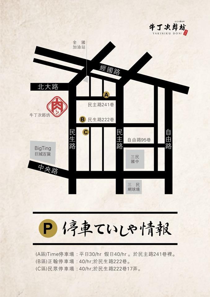 牛丁次郎坊新竹店位在民生路上,靠近北大路,對面全家內有停車場,文末附上停車路線圖,從最近的停車場走到店只要三分鐘,夏日炎炎實在需要方便停車的店家(汗)。
