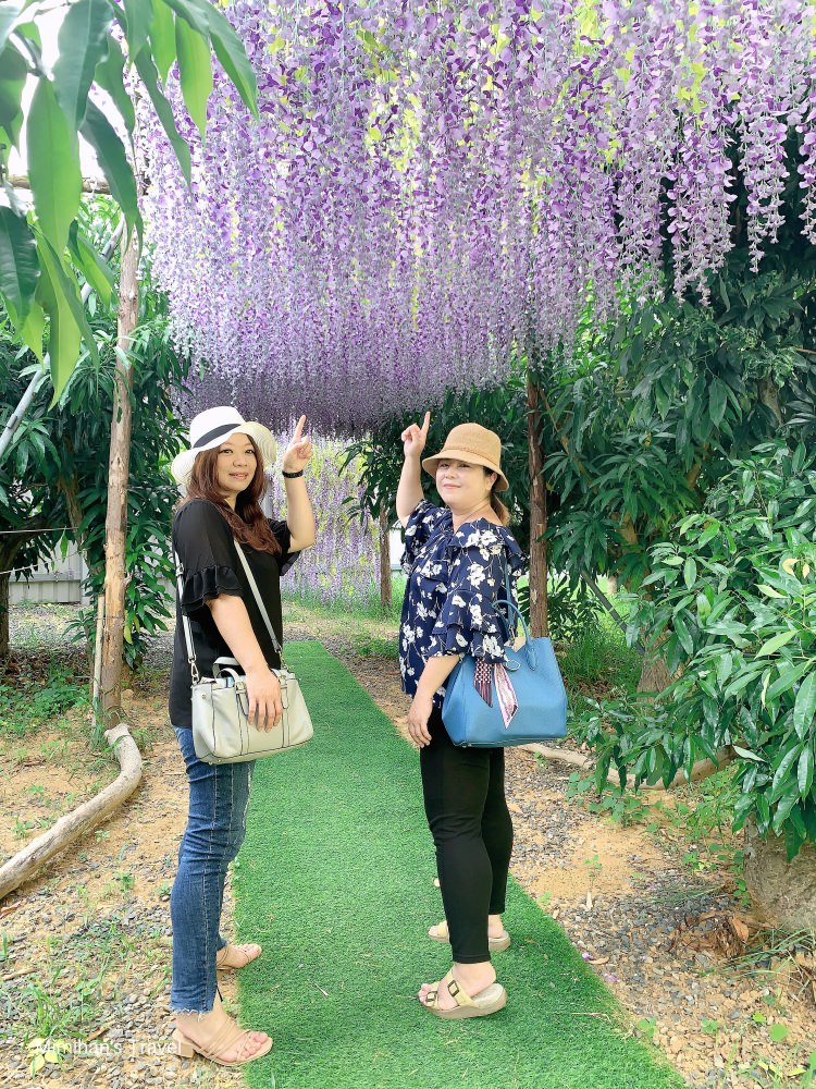 在櫃檯買好票,順著參觀步道往後面的梅花鹿園區走,沿途還佈置了一條紫藤花步道,據說是真的有引進紫藤花,但因為大概要好幾年才能長成,所以暫時先用假花替代。