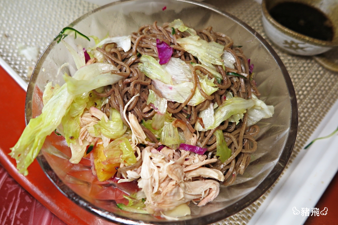 上桌的時候會同時附上手套讓客人自行動手,這種拆解動作實在大快人心!老闆娘教我們怎麼搭配這些醬料做出不同吃法,先豪邁地轉下雞腿、扭下雞翅,再細細的挑出雞胸肉跟雞骨架,再把醬料、沙拉、麵條組合一起。