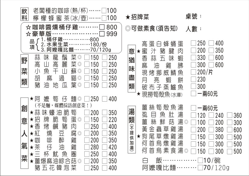咖啡醬燻桶仔雞 單點$800/豪華版$999 (包含桶仔雞/水果生菜/咖啡麵)