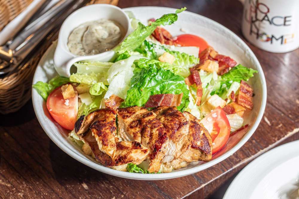 再來,就算你不想吃澱粉,嘿嘿,也有這一道特製雞肉凱薩沙拉(229元,份),大碗滿足又不膩口,單吃或是搭酒都再適合不過了