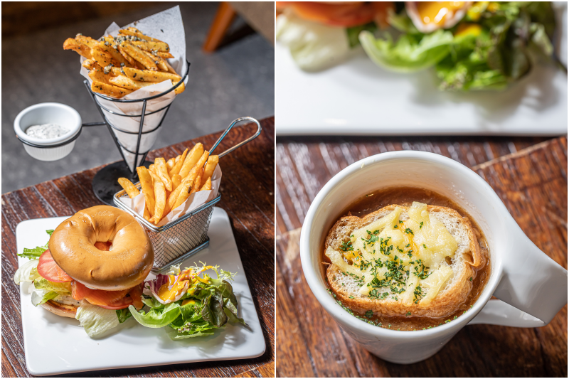再來,就是左圖的燻鮭魚佐奶油起士貝果三明治(339元,份)與左後方的松露薯條 (219元,份),以及右邊的法式洋蔥湯 (139元,份)