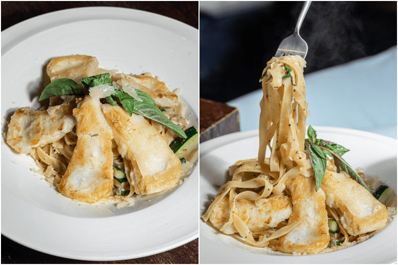寬版麵條不會過硬,但還是能兼具不錯的嚼感,櫛瓜的風味讓整份麵點不會給人過度負擔,而鱈魚細緻鮮嫩,不管是大人或孩子都難以抵抗