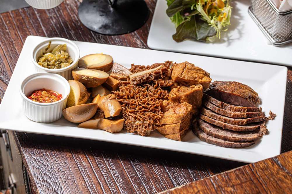好,飲料點完之後,如果真的想要吃個愉快,當然必推的就是滷味拼盤(包括滷蛋與牛腱牛肚,以及花干與杏鮑菇)(299元,份)