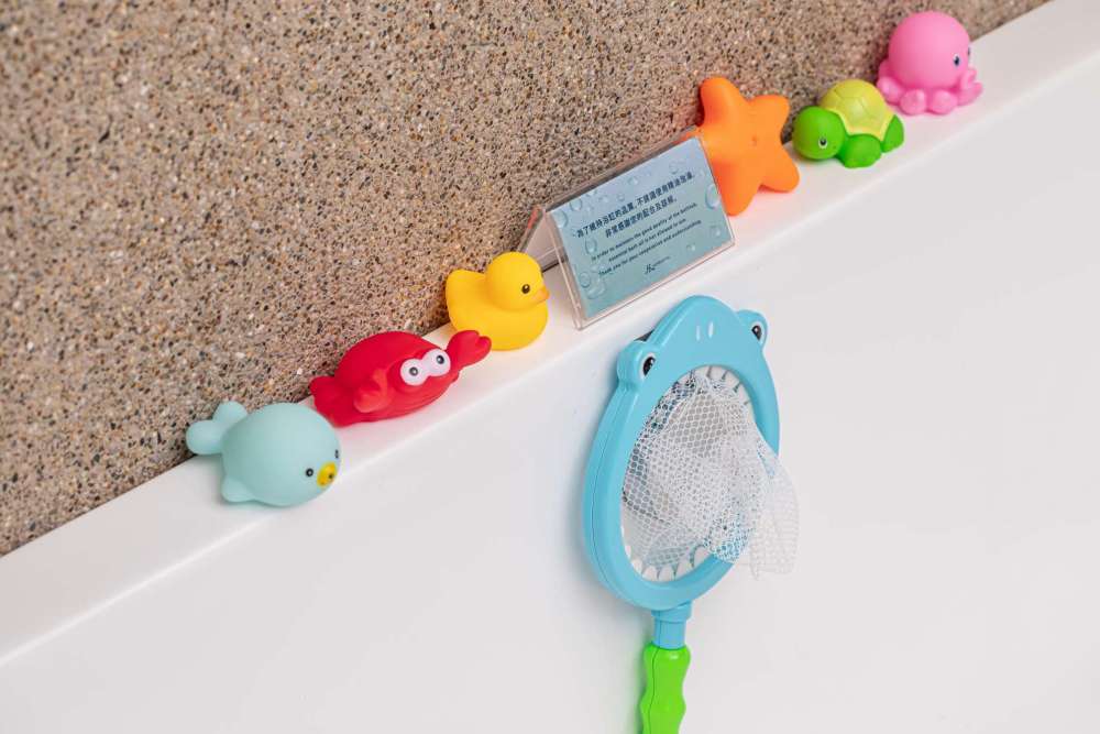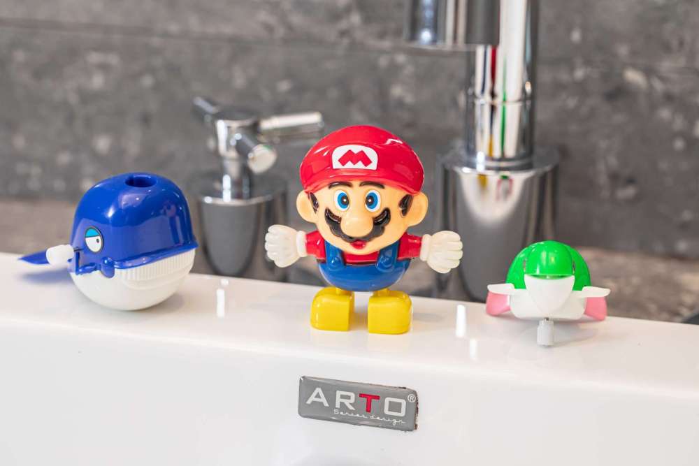 再來,純淨逸寬家庭套房裡面有配置浴缸,也有很適合孩子的洗澡玩具,而這一間的玩具是馬力歐,原因是這個房型是有配置跟瑪莉歐相關的選擇,這個等等會再跟大家分享