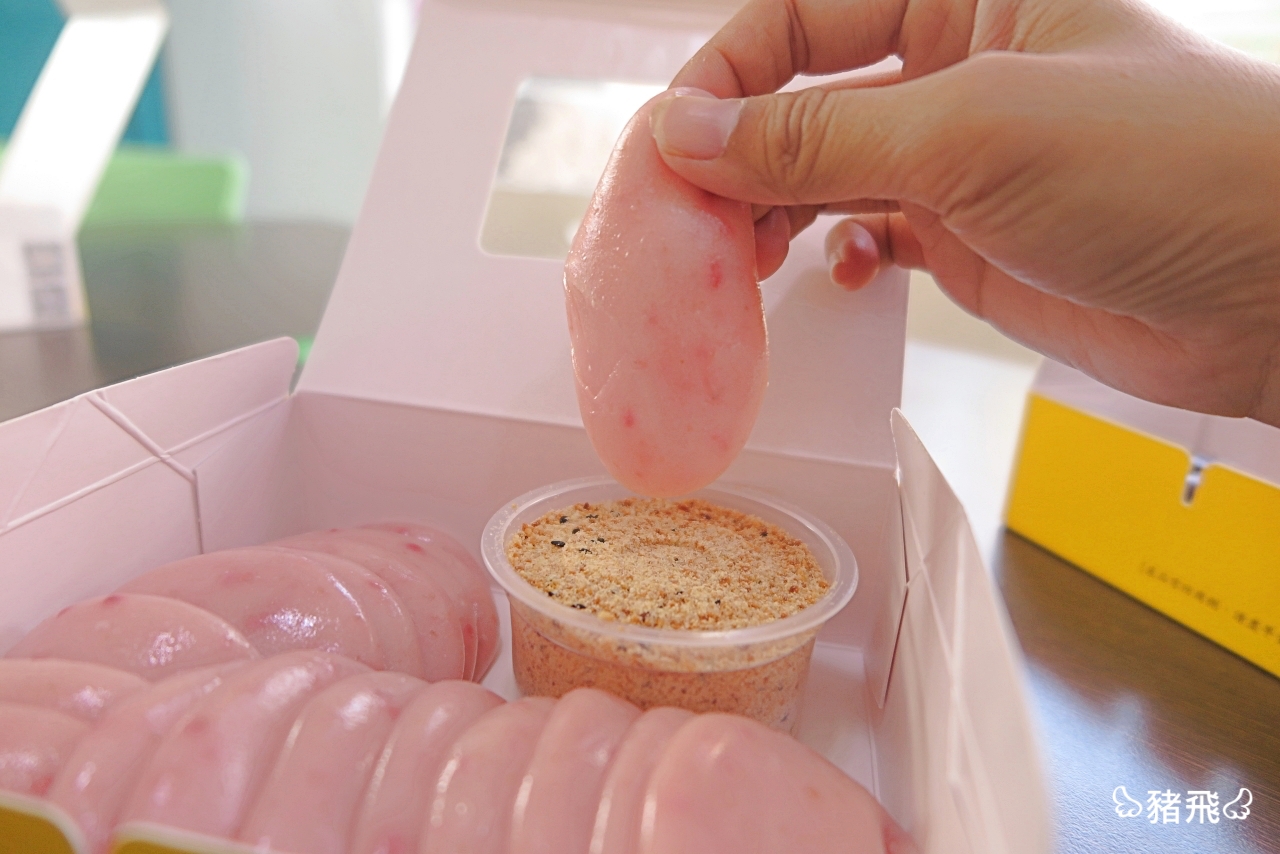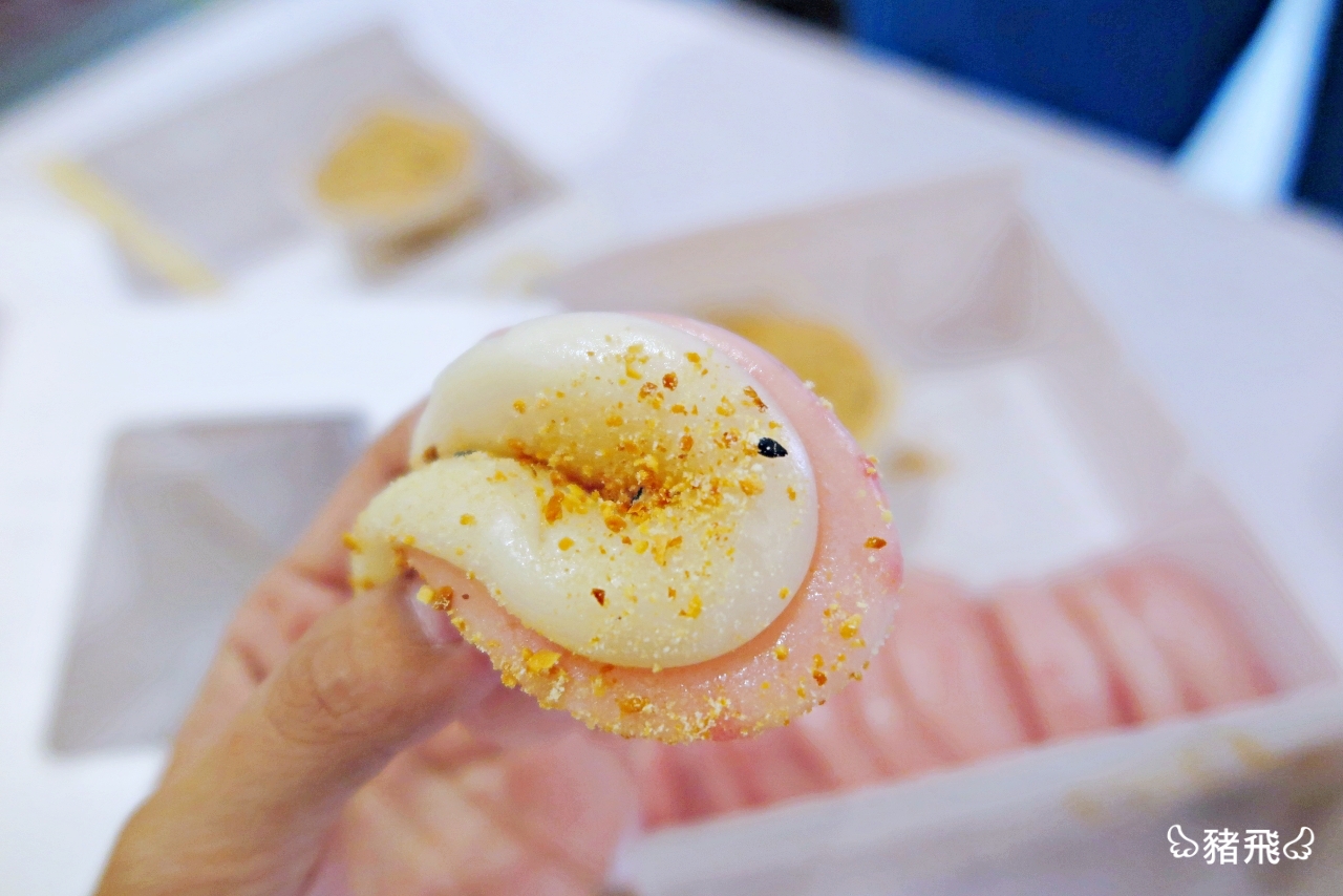 ▲跟我一樣麻糬控的朋友!教你這樣吃法,把粉紅色、白色包著一起吃,不只口感加倍Q彈,顏色也好美呀!像一朵麻糬花(笑)。