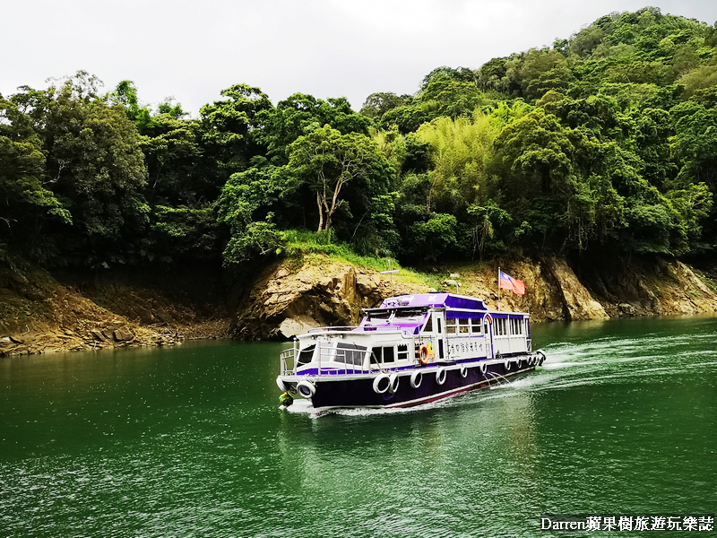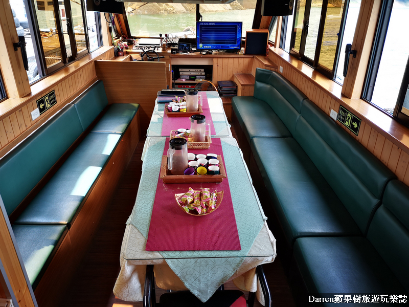 水上之旅的遊船內部寬敞座椅舒適,有卡拉ok設備可以唱歌,也會有導覽石門水庫周邊景色