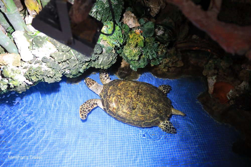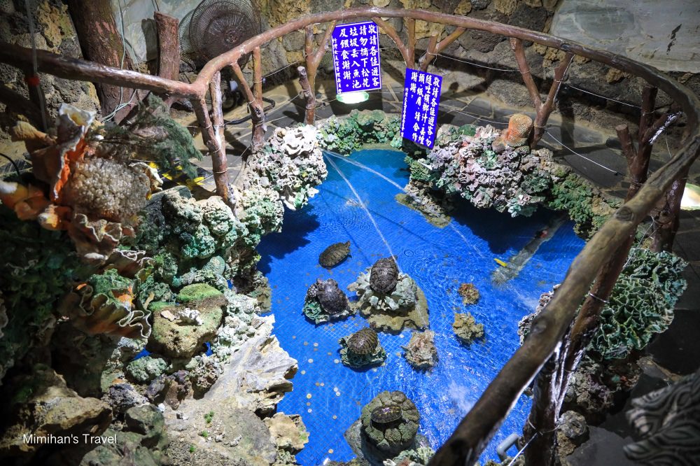 裡面分成好幾個不同的洞穴區域,而且真的養了好多海龜,大概有十幾隻,其中還有保育類的綠蠵龜,說真的當下看牠們生活在這樣小小不見天日的池子中感覺實在很不OK,本來想說要罵一頓這樣的行為。