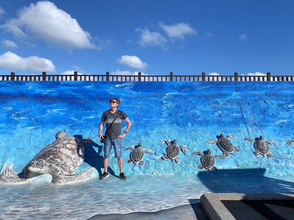 這隻澎湖IG必拍的大海龜有點比較難找,我們雖然知道在竹灣大義宮附近,但還是在村莊裡稍微繞了一下才找到,確切地點就在「舊竹灣社區活動中心」門口的堤防上,想省時間大家可以直接問附近居民比較快。