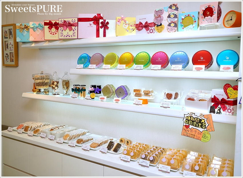 ▼一進到裡頭,服務人員親切有禮的招呼著;右側的層板上擺了滿滿的禮盒、曲奇餅、月餅、手作餅乾等商品展示,讓客人更方便參考!