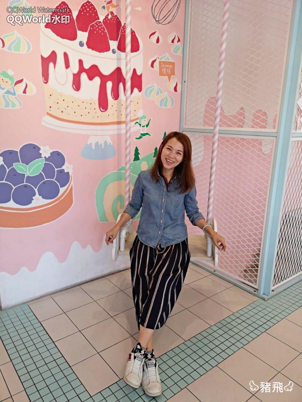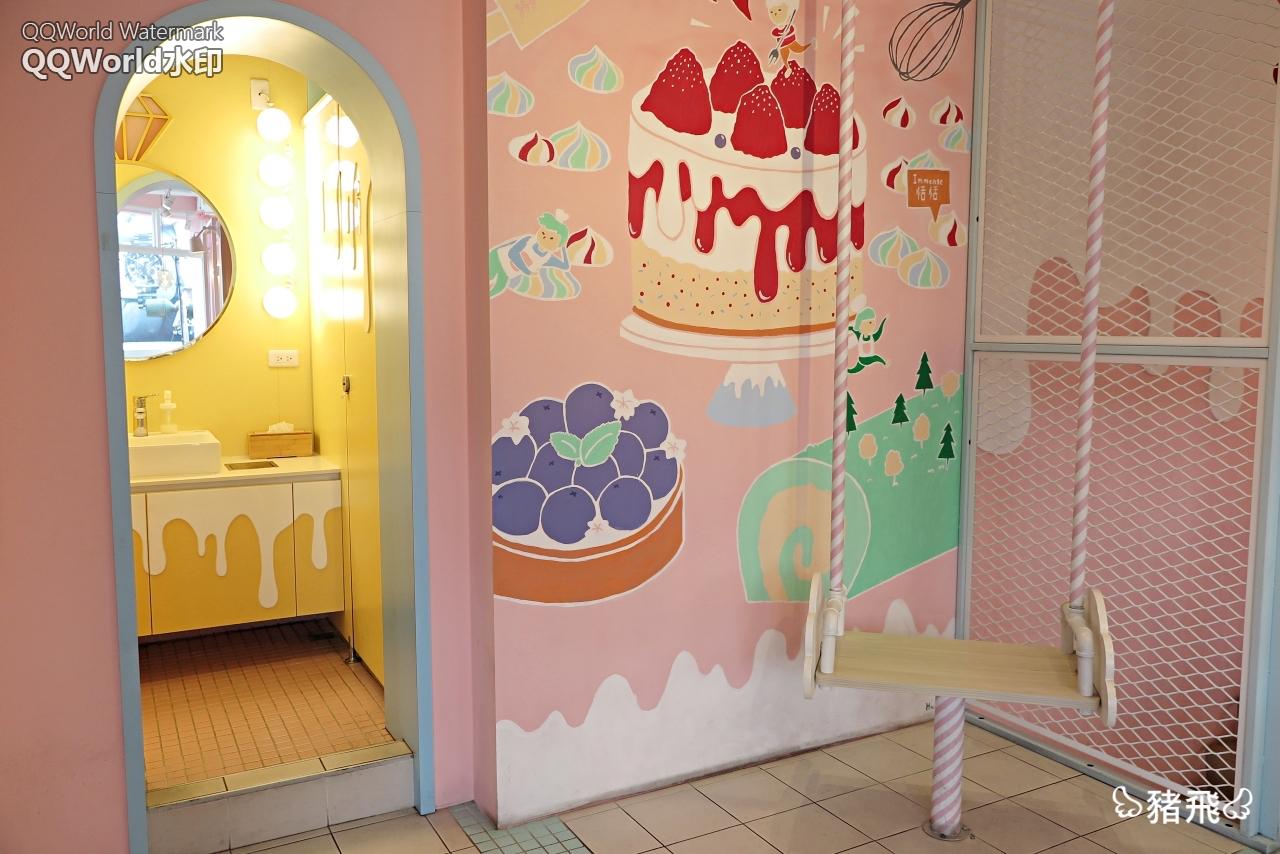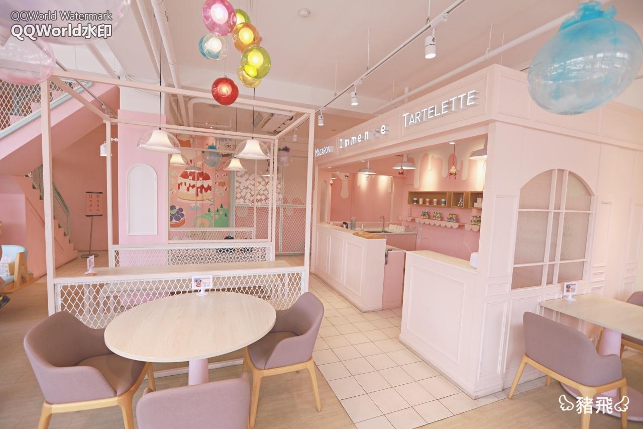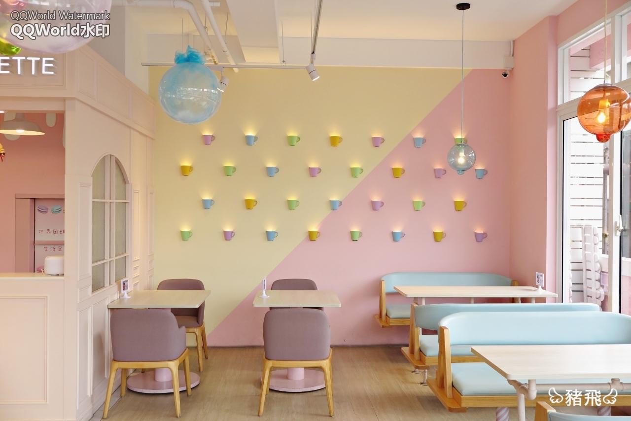 點餐後由店員引導到二樓等待用餐。二樓也是超療癒的粉色系裝潢,每個座位舒適寬敞。除了粉色工作檯,許多牆面的布置也很有巧思,比如流出奶油的痕跡、鞦韆甜點形象牆,還有一整面非常惹人注目的馬卡龍色系馬克杯燈光牆!真的不管哪個角落都能拍出許多網美照,相機拍不停啦!