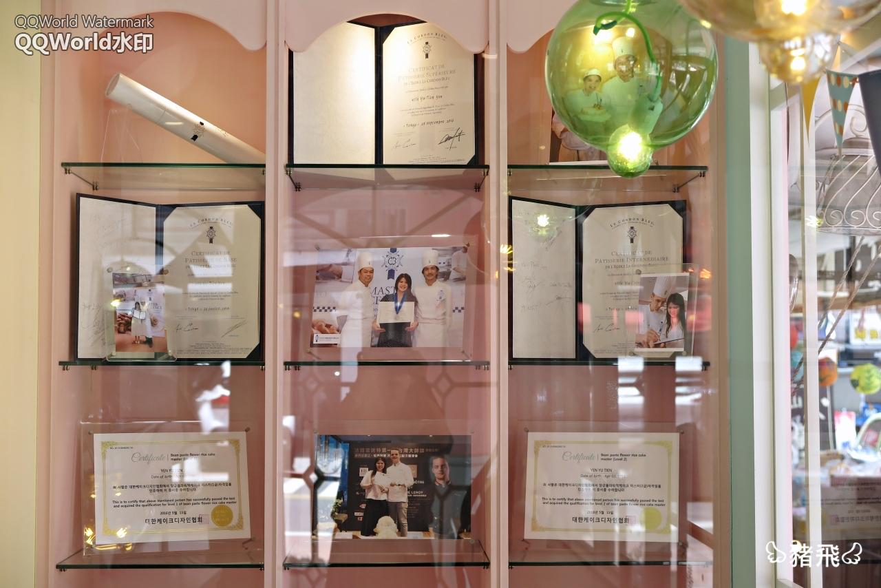 Immense恬恬從店外到店內的空間花了不少心思精心佈置,還沒進店就感受到滿滿的夢幻浪漫。用打蛋器做成的tiffany藍色門把,把甜點的巧思都放進這座城堡裡了。推門進店,店內部的布置延續歐式童話風,加上甜點櫃的陳列,就像進到一間糖果屋,連座椅都像一個個的馬卡龍!