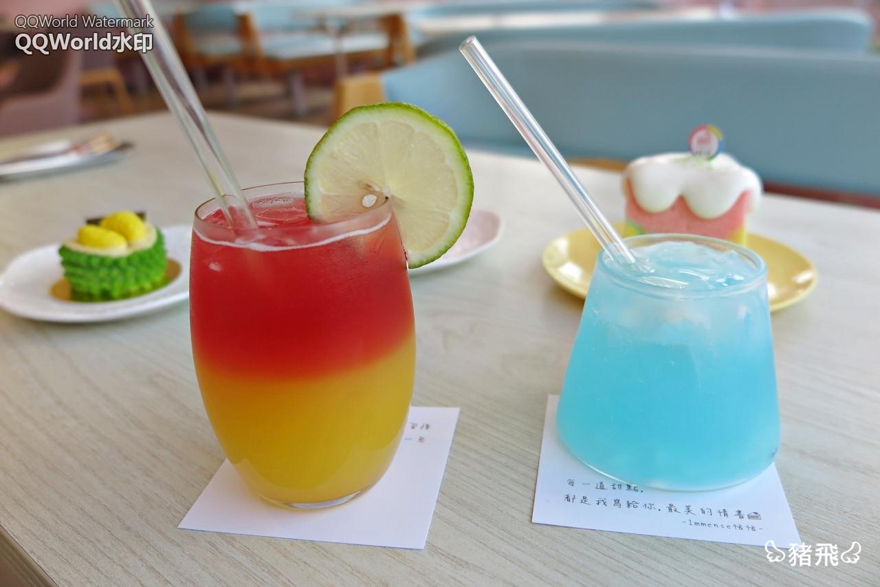 ▲最後是雙層飲料「蔓越莓+柳橙」、藍白色「藍柑橘氣泡水」,雙色的視覺搭配相當好看,搭上甜點清爽解膩,為下午茶畫上完美的句點。