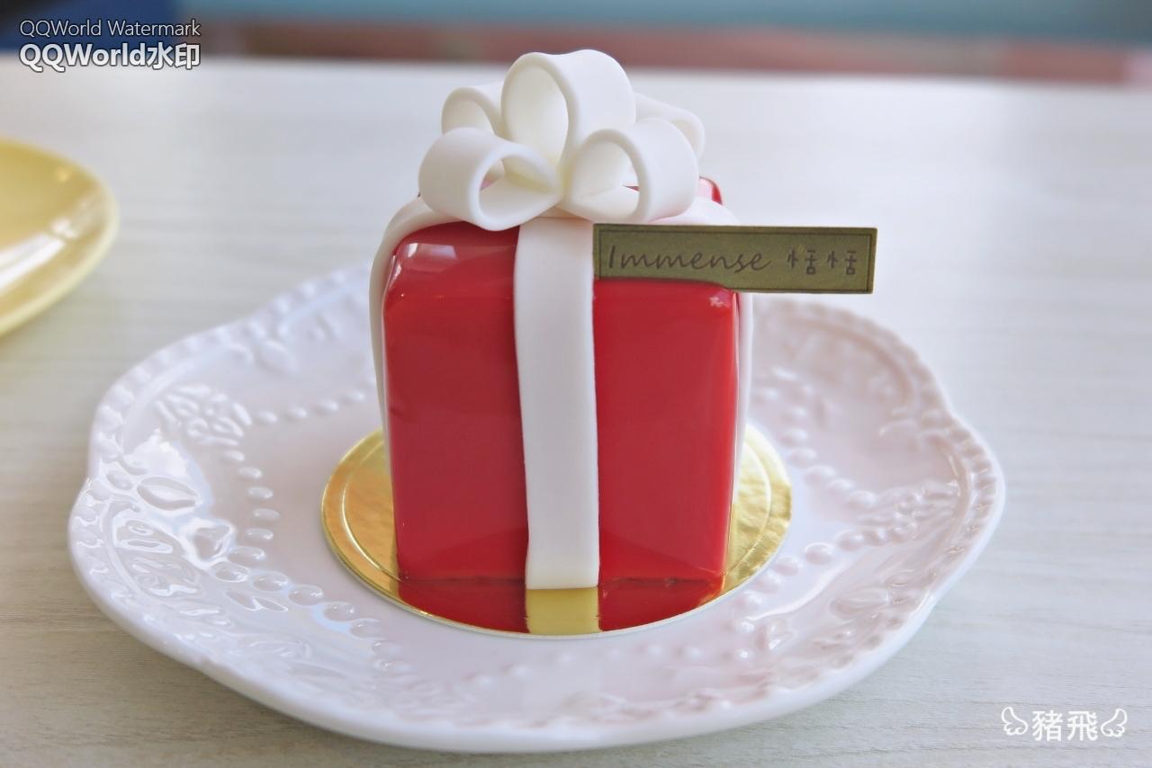 哇!這個甜點太可愛了!首先是這個像是裝著戒指的紅色禮物盒,第一眼看到它就被精巧外觀吸引,馬上點了一顆。紅色禮物盒是慕斯蛋糕體,外觀的白色的綁帶是翻糖,內餡是青蘋果、焦糖奶酪和水蜜桃餡(哇哈哈~我猜的啦,至於答案正不正確就不知道囉)柔軟酸甜的口感清爽不甜膩,就像初戀的滋味。