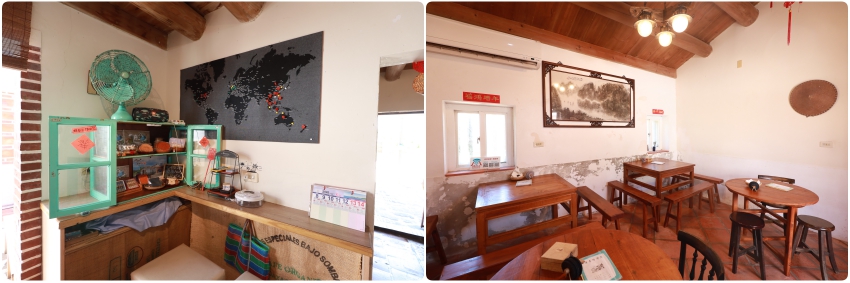 而它也沒讓我們失望,咖啡店裡也是佈置的古色古香,拍照效果很棒,尤其喜歡門口座位區在烈日下形成的光影,還有屋頂的風景也是很多網美們來二崁聚落必拍的畫面。