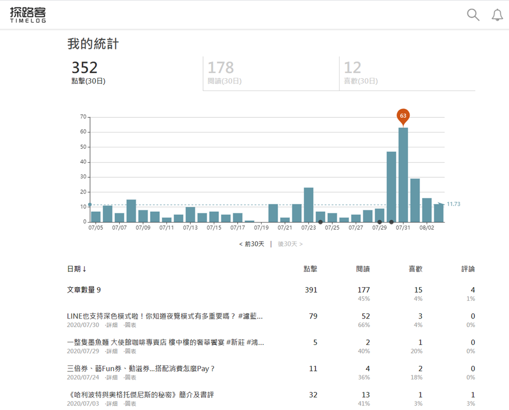 對於創作者來說,和觀眾互動、了解觀眾想知道什麼內容是創作很重要的一環,因此探路客後台提供「統計」功能,可以知道單天的文章點擊量、閱讀量、讀者喜歡的程度、讀者的留言數量,若選擇單一篇文章也可以細看單篇文章的表現,而且是以圖表方式呈現,方便創作者一目了然文章狀況,不需要透過任何外掛就可以直接檢視文章成效,非常方便。