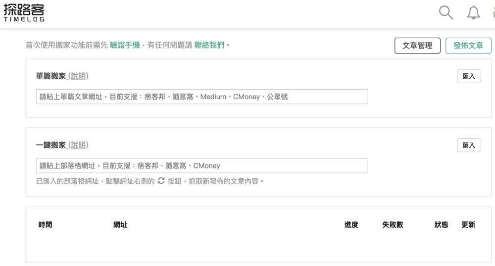 針對原先就有在其他創作平台寫作的創作者,探路客提供了文章搬家功能,完成手機號碼驗證之後就可以將其他平台的文章搬移到探路客裡,目前單篇搬家支援痞客邦、隨意窩、Medium、CMoney、公眾號等平台,若是要搬移整個部落格的文章,目前則支援痞客邦、隨意窩和 CMoney,如果舊平台有新增文章,只要按下重新整理就會抓取新發布的文章內容,文章搬家是透過複製備份匯入的方式搬家,因此不會對原始網站和文章造成影響,可以安心搬家。