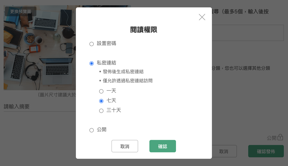 發稿時則提供多種發佈模式,若是一般文章直接點選公開發佈即可,若是不想被外人閱讀的文章,則可加上密碼保護,若是和不同廠商合作的文章,更有提供「私密連結」功能,在文章發表後可以設定一天、七天、或是三十天時長的私密連結,在這段時間內只能透過此私密連結瀏覽文章,待內容都確認過後再行發表。