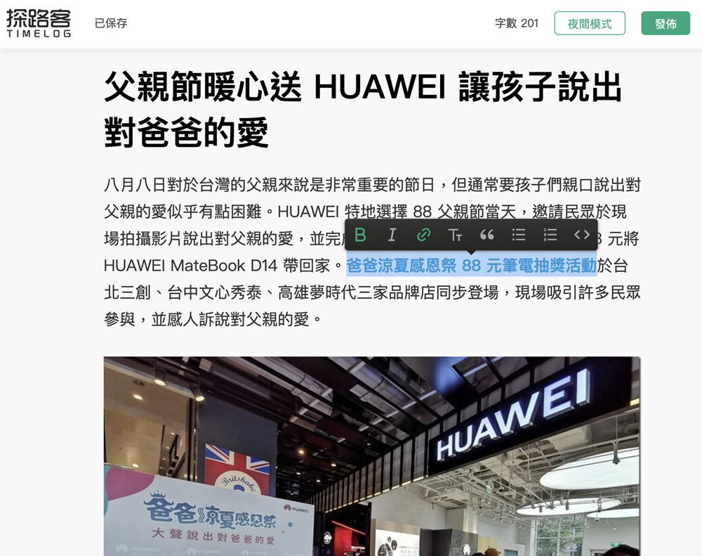 省略一般佔空間的編輯器項目,如果想要針對文字加上不同的特效的話,只要選取想修改的文字後,文字上方就會自動顯示常用的工具,包含粗體、斜體、超連結、字級、引言、項目符號、排序符號、文字碼等工具。