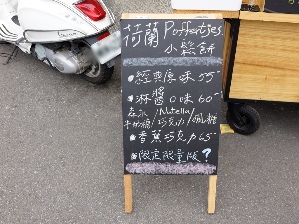 專賣荷蘭小鬆餅,口味與價格會寫在旁邊的黑板上,除了固定口味,每天還會推出不同的限定口味~