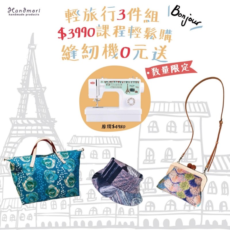 現在報名「輕旅行 3 件組手作課程」(學費 3990元,不含布料材料工具),報名且完成付款者,就送一台價值 4980 元的縫紉機!各位沒有看錯,只要報名課程,就送縫紉機!